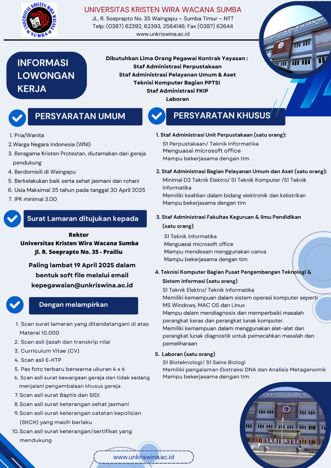 Universitas Kristen Wira Wacana Sumba (Unkriswina Sumba) membuka lowongan pekerjaan kontrak Yayasan untuk lima formasi: