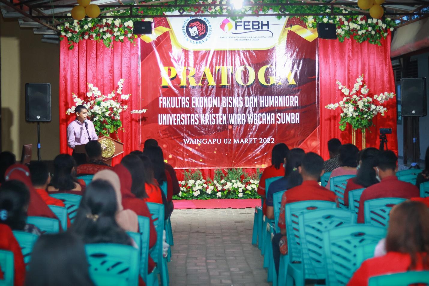 Waingapu, 2 Maret 2022 merupakan hari bahagia yang dirasakan oleh 41 orang calon winisuda Fakultas Ekonomi Bisnis dan Humaniora (FEBH), pasalnya telah diselenggarakan acara pratoga FEBH. Acara pratoga dilakukan secara online melalui live streaming youtube dan offline (tatap muka) yang dilaksanakan di Aula Kampus Unkriswina Sumba. Kegiatan ini dihadiri oleh oleh jajaran pimpinan di lingkungan Unkriswina, orangtua/wali calon winisuda dan Bapak/i staf di lingkungan Unkriswina Sumba.