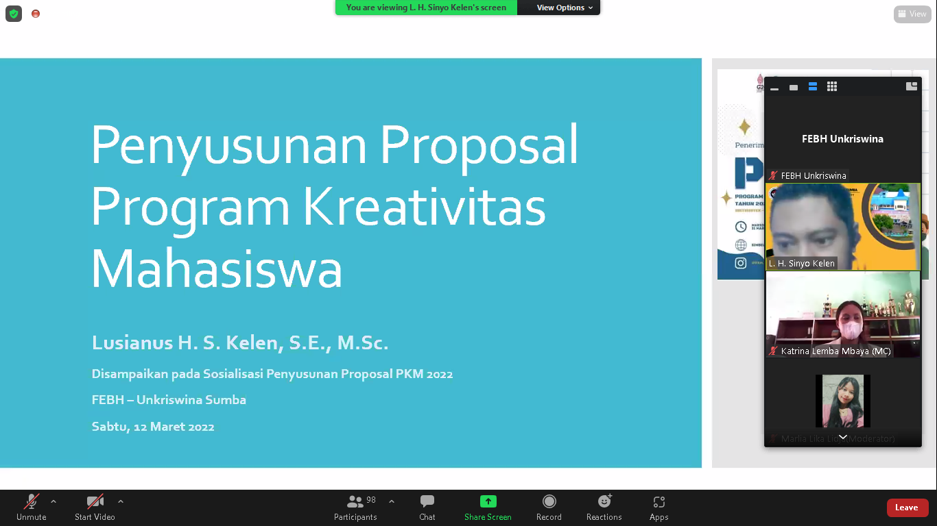 Sosialisasi Penyusunan Proposal PKM (Program Kreativitas Mahasiswa) Fakultas Ekonomi Bisnis dan Humaniora Universitas Kristen Wira Wacana Sumba