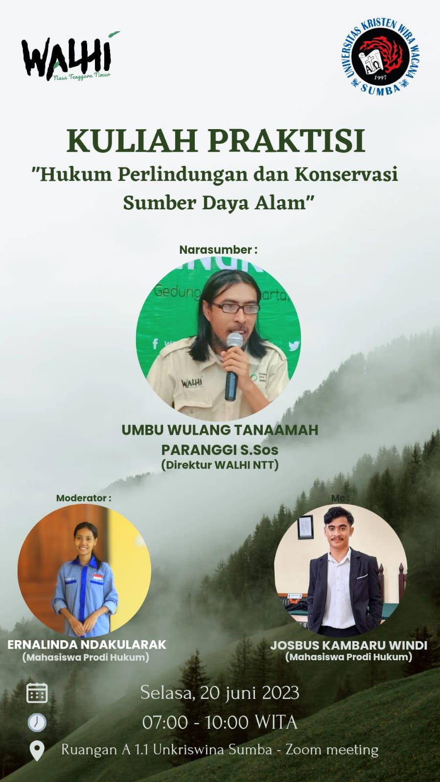 Program Studi Hukum di Universitas Kristen Wira Wacana Sumba (Unkriswina Sumba) telah sukses melaksanakan kuliah praktisi dalam mata kuliah Hukum Perlindungan dan Konservasi Sumber Daya Alam. Kegiatan ini merupakan bagian dari upaya universitas dalam mengimplementasikan program Merdeka Belajar – Kampus Merdeka (MB-KM) guna meningkatkan kolaborasi antara perguruan tinggi dan lembaga/instansi yang memiliki peran penting dalam berbagi ilmu dan pengalaman.