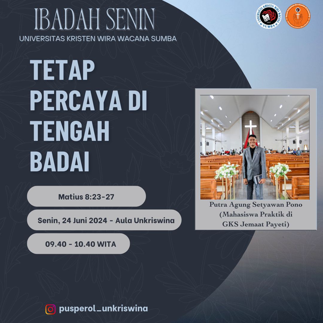 Pusperol Unkriswina Sumba ingin mengajak seluruh sivitas akademika untuk ikut serta dalam Ibadah Senin, yang akan dipimpin oleh Putra Agung Setyawan Pono (Mahasiswa Praktik di GKS Payeti) dengan tema “Tetap Percaya di Tengah Badai”.