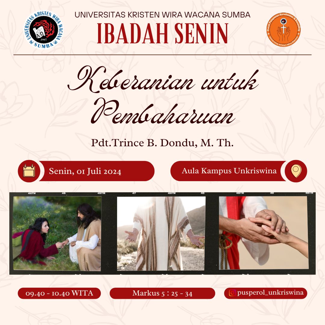 Pusperol Unkriswina Sumba ingin mengajak seluruh sivitas akademika untuk ikut serta dalam Ibadah Senin, yang akan dipimpin oleh Pendeta Kampus Unkriswina Sumba, Ibu Pdt. Trince B. Dondu, M.Th., dengan tema “Keberanian untuk Pembaharuan”.