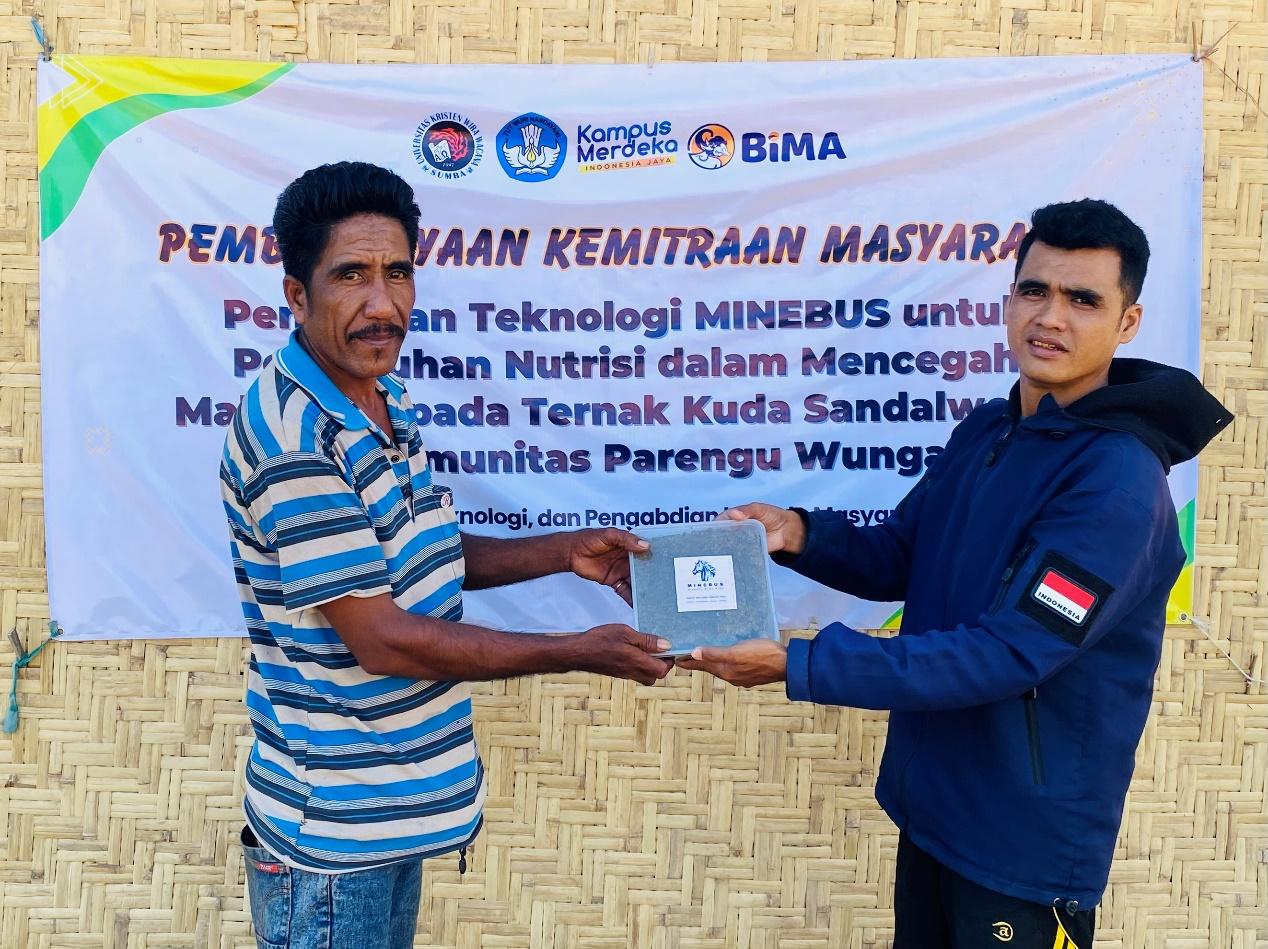 Pelatihan pakan mineral blok plus (MINEBUS) dilakukan oleh tim PkM Unkriswina Sumba di Komunitas Parengu Wunga. Kegiatan ini dilaksanakan pada hari Kamis 22 Agustus 2024 di lokasi peternak kuda Sandalwood. Kegiatan ini dimulai dengan persiapan bahan pakan dan alat untuk pembuatan pakan. Peternak kuda Sandalwood diberi pelatihan tentang cara meramu atau formulasi pakan dan cara pembuatannya menjadi pakan berbentuk blok. Pakan mineral blok plus ini mengandung nutrisi seperti protein, karbohidrat, vitamin dan mineral yang berguna untuk mendukung pertumbuhan ternak kuda. Pada kesempatan itu, peternak diberikan pakan mineral blok plus yang telah dicetak menjadi blok untuk diberikan kepada ternak kuda. Cara pemberian pada ternak kuda yakni disimpan di tempat makan pada kadang atau bisa juga di gantung pada sekitaran kandang yang nantinya ternak kuda akan mengonsumsi dengan cara dijilat maupun digigit. Pada kesempatan itu, dosen Unkriswina Sumba sebagai ketua tim PkM bapak Marselinus Hambakodu, S.Pt.,M.Si menyampaikan bahwa kondisi padang penggembalaan alam kita saat musim kemarau memiliki kualitas yang sangat jelek, dimana kandungan serat kasar tinggi dan kandungan protein kasar yang rendah. Lebih lanjut disampaikan bahwa berdasarkan hasil penelitiannya pada rumput alam yang ada di padang penggembalaan memiliki kandungan serat kasar 40-59%, dan protein kasar 3-4% dan daya cerna yang sangat rendah. Jadi jika hanya pemberian rumput alam tunggal saja pada ternak kuda maka akan mempengaruhi performa kuda karena kekurangan nutrisi atau malnutrisi. Oleh karena itu, perlu adanya teknologi pakan seperti MINEBUS, yang akan berguna untuk memacu tingkat konsumsi dan menambah nutrisi untuk pertumbuhan agar keseimbangan nutrisi yang dibutuhkan tetap seimbang. Pada kesempatan itu, ketua Komunitas Parengu Wunga bapak Barnabas Panji Deru, SE menyampaikan bahwa hadirnya kegiatan pengabdian tentang MINEBUS kali ini cukup membantu peternak kuda. Selama ini belum pernah ada pakan suplemen yang diberikan pada ternak kuda, hanya pemberian rumput alam secara tunggal. Lebih lanjut disampaikan bahwa banyak juga kejadian ternak kuda Sandalwood kurus hingga sampai jatuh karena efek kelaparan di musim kemarau.