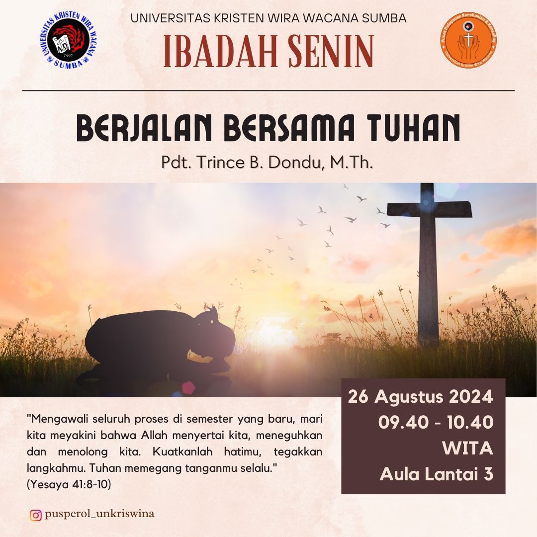Pusperol Unkriswina Sumba ingin mengajak seluruh sivitas akademika untuk ikut serta dalam Ibadah Senin, yang akan dipimpin oleh Pendeta Kampus, Ibu Pdt. Trince B. Dondu, M.Th., dengan tema “Berjalan Bersama Tuhan”.
