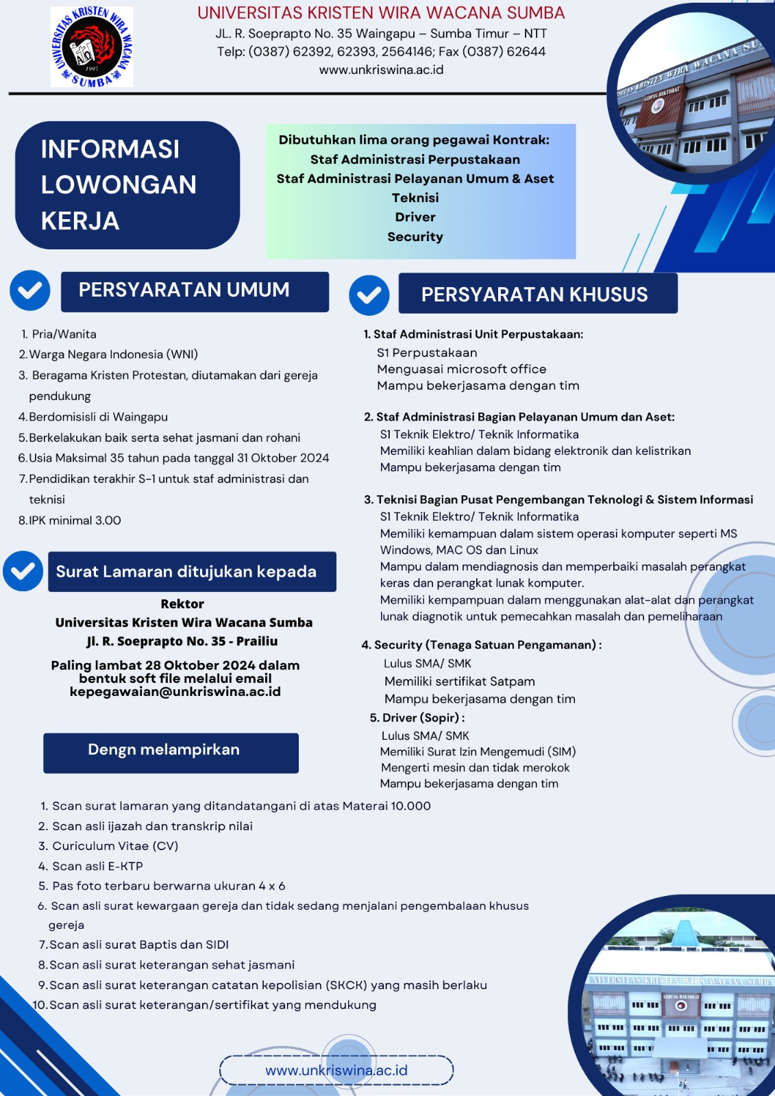 Universitas Kristen Wira Wacana (Unkriswina) Sumba membuka kesempatan untuk bergabung sebagai pegawai kontrak di posisi: