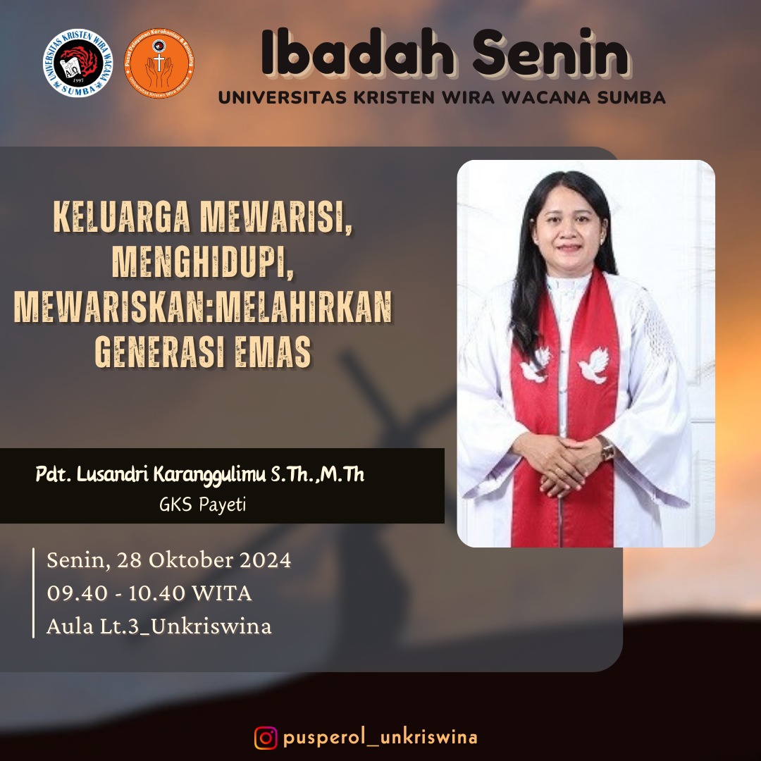 P : Ibadah Senin pagi ini berlangsung di bawah tema: “ Keluarga mewarisi,menghidupi dan mewarsikan: Melahirkan Generasi Emas ” sebagai pengingat agar kita berperan aktif dalam mewarisi,menghidupi dan mewariskan nilai kebenaran agar tercipta generasi emas yang berintegritas,berkarakter dan mampu menghadapi tantangan masa depan dengan iman yang teguh.