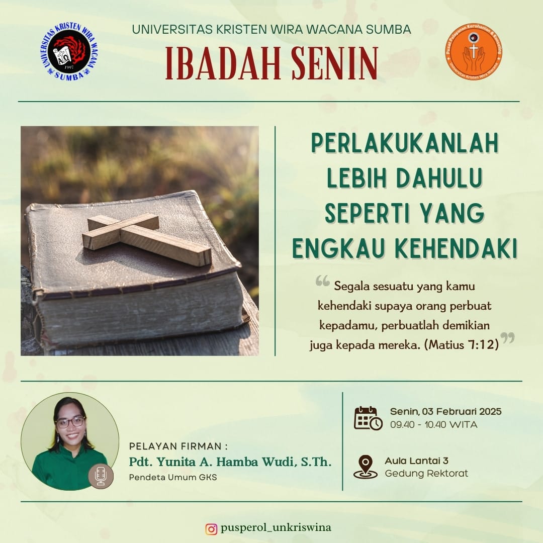 P : Ibadah Senin pagi ini berlangsung di bawah tema “Perlakukanlah Lebih Dahulu Seperti yang Engkau Kehendaki” sebagai pengingat agar kita senantiasa memperlakukan sesama seperti kita ingin diperlakukan yang mencerminkan kasih Kristus dalam setiap tindakan dan perkataan kita.