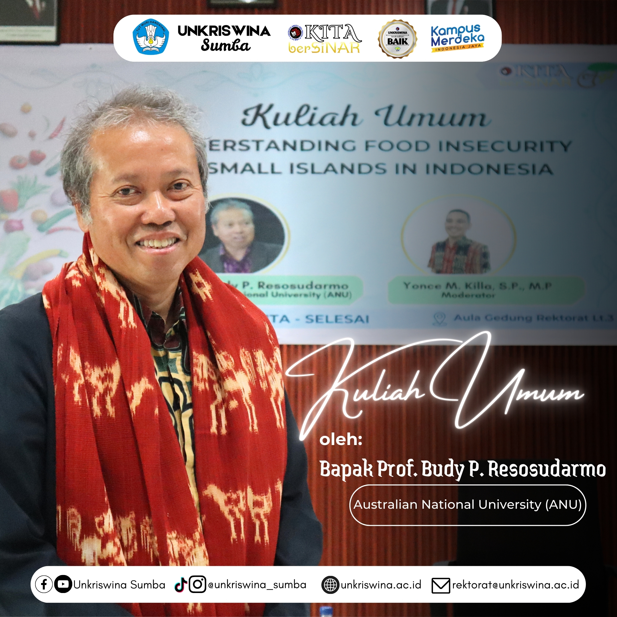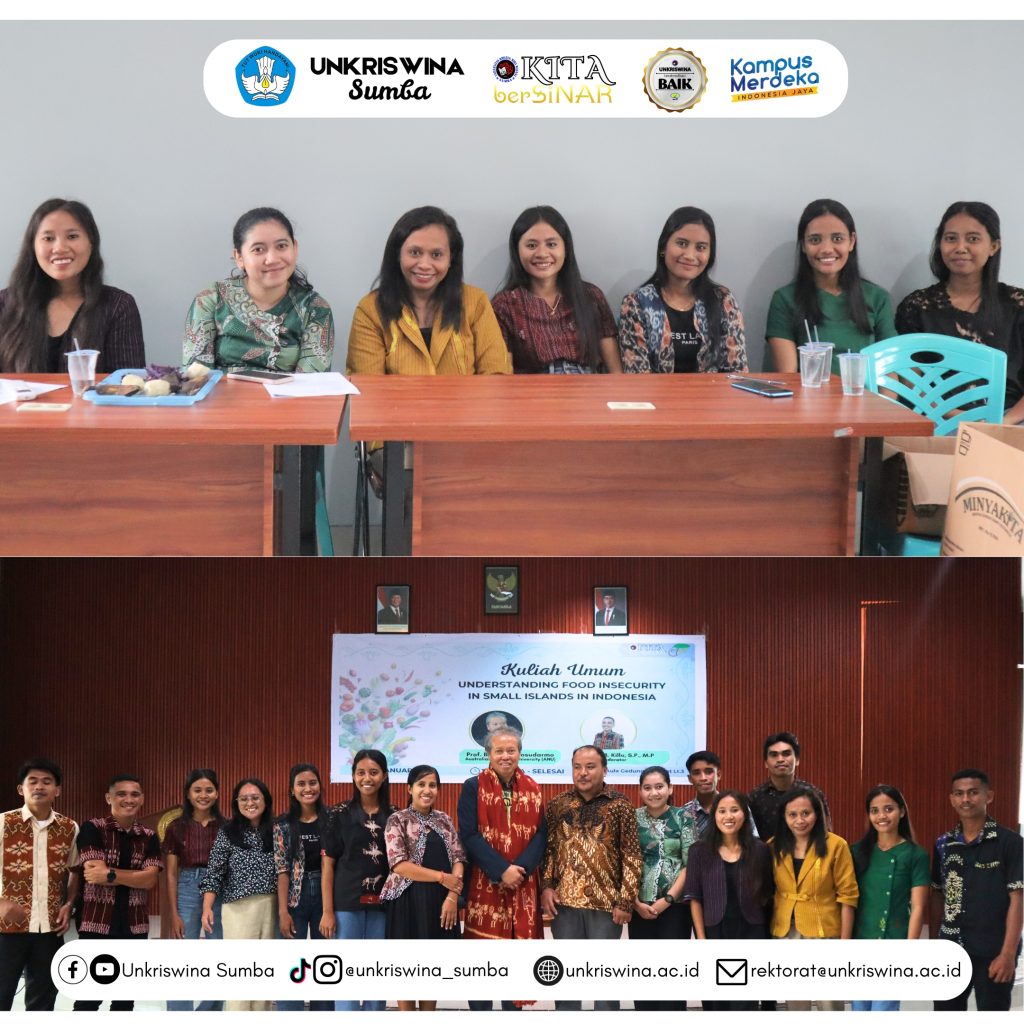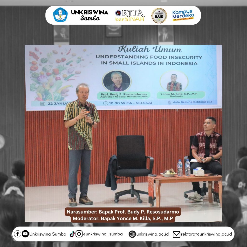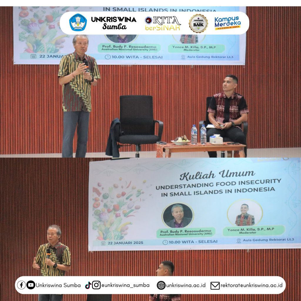 Sumba, 22 Januari 2025 – Program Studi Agroteknologi, Fakultas Sains dan Teknologi (FST) Universitas Kristen Wira Wacana (Unkriswina) Sumba menggelar kuliah umum bertajuk “Understanding Food Insecurity in Small Islands in Indonesia”. Acara ini menghadirkan Prof. Budy P. Resosudarmo dari Australian National University (ANU) sebagai pembicara utama, dengan moderator Bapak Yonce M. Killa, S.P., M.P., dosen Prodi Agroteknologi Unkriswina Sumba.