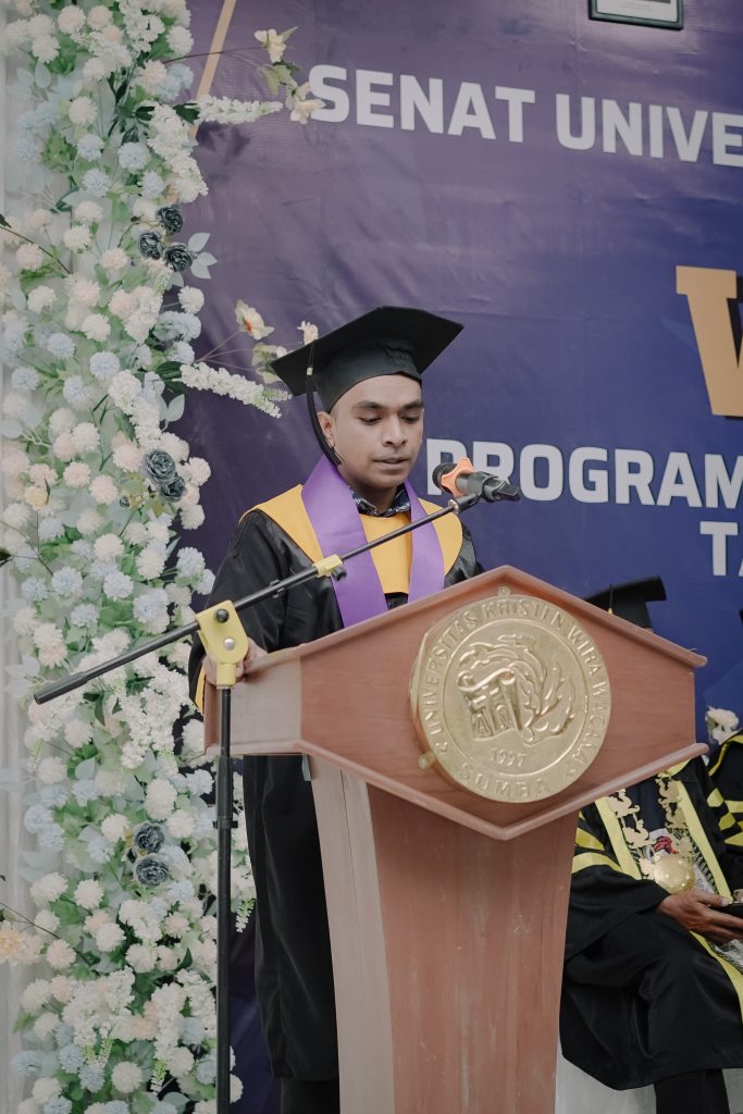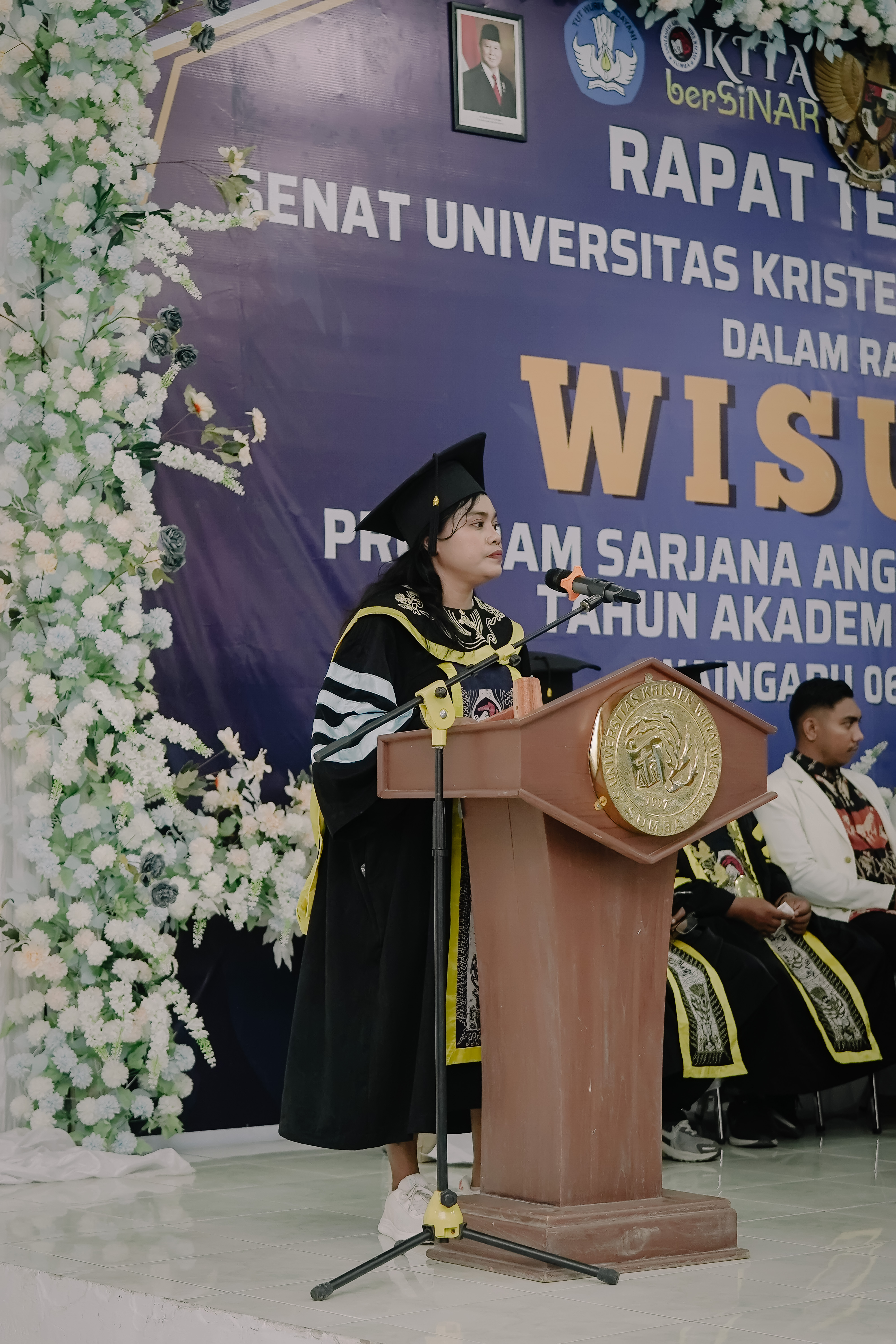 Pengukuhan lulusan ditandai dengan pembacaan lagu Gaudeamus Igitur, serta Janji Winisuda yang dibacakan oleh Abed Nego Dundu Tola, S.E. Sambutan dari perwakilan wisudawan disampaikan oleh Umbu Theofilus Dendimara, S.Kom., yang mewakili semangat dan harapan para lulusan dalam menyongsong masa depan.