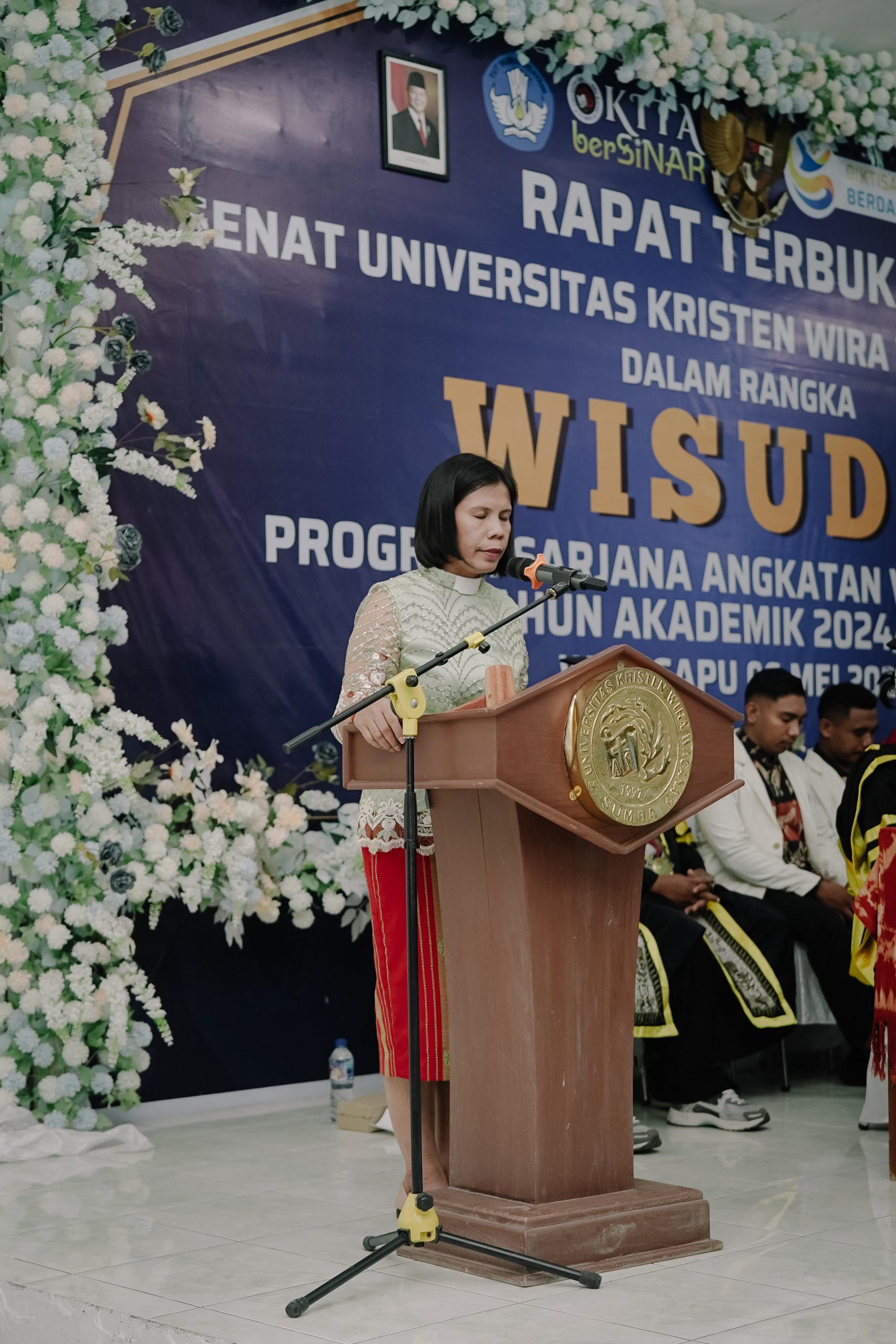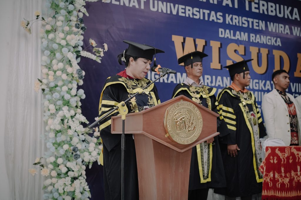 Kepala Bagian Administrasi Akademik, Anggreni Barnabas, S.H., menyerahkan laporan akademik dan daftar lulusan kepada Rektor Unkriswina Sumba, Dr. Maklon Felipus Killa, S.E., M.Si., yang kemudian melanjutkan dengan pengukuhan resmi para lulusan.