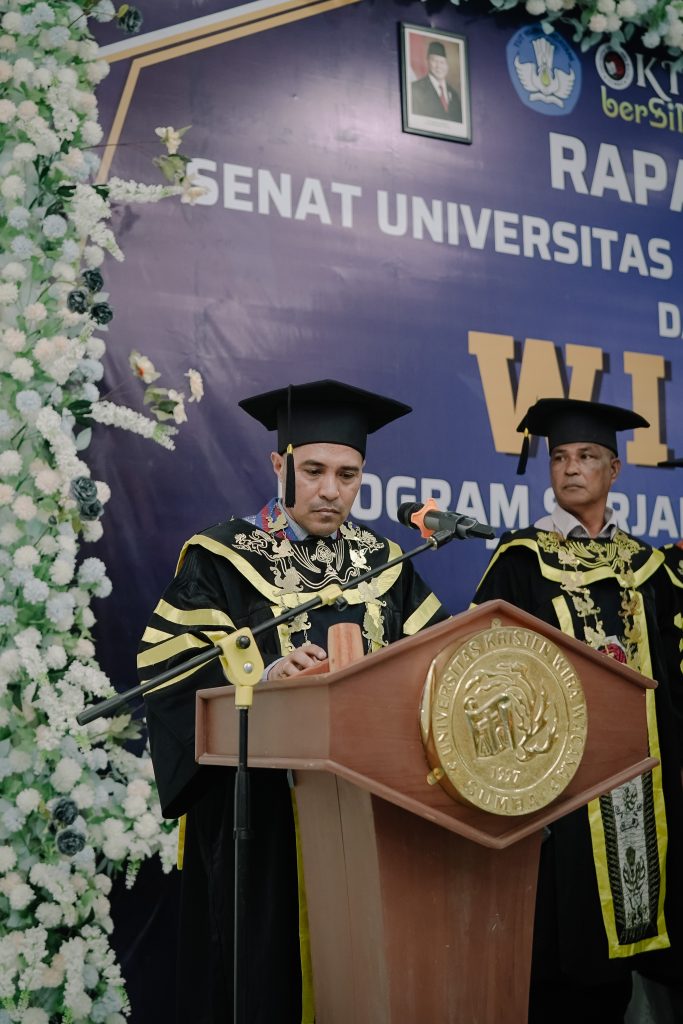 Dalam pidatonya, Rektor menegaskan bahwa Unkriswina Sumba terus menyesuaikan diri dengan arah kebijakan nasional. Sejak 2 Mei 2025, seluruh program studi mulai mengimplementasikan kebijakan Kampus Berdampak, menggantikan konsep Kampus Merdeka. Pendekatan ini mengutamakan pembelajaran berbasis pengalaman langsung di masyarakat, melalui magang, riset, inovasi sosial, dan pemberdayaan komunitas. “Mahasiswa tidak hanya belajar di ruang kelas, tapi harus terjun ke lapangan dan membawa perubahan nyata,” tegas Rektor.
