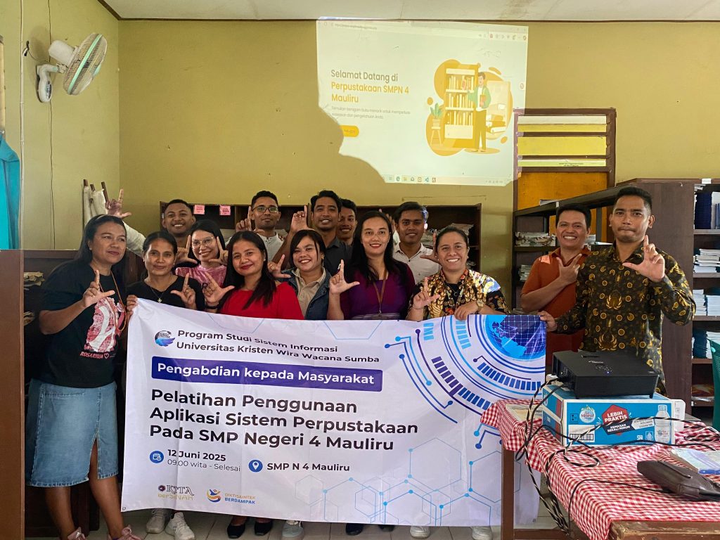 Waingapu, 12 Juni 2025 – Universitas Kristen Wira Wacana (Unkriswina) Sumba kembali menunjukkan komitmennya dalam menjalankan Tri Dharma Perguruan Tinggi melalui kegiatan Pengabdian Kepada Masyarakat (PKM). Kali ini, tim dari Program Studi Sistem Informasi (SIF) melaksanakan Pelatihan Penggunaan Aplikasi Sistem Perpustakaan di SMP Negeri 4 Mauliru pada Kamis, 12 Juni 2025.