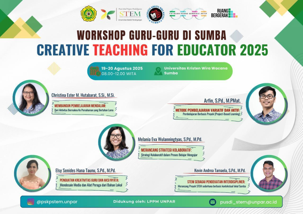 Waingapu, Fakultas Keguruan dan Ilmu Pendidikan (FKIP) Universitas Kristen Wira Wacana (Unkriswina) Sumba bersama Universitas Katolik Parahyangan (Unpar) sukses menggelar Workshop Creative Teaching for Educator 2025 pada 19–20 Agustus 2025. Kegiatan yang berlangsung di Kampus Unkriswina Sumba ini menjadi ruang kolaborasi penting bagi guru dan calon guru untuk memperkaya strategi pembelajaran kreatif berbasis STEM.