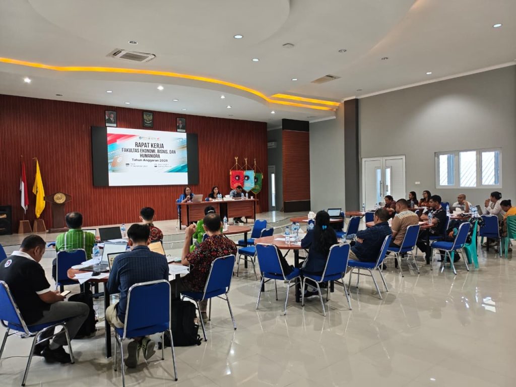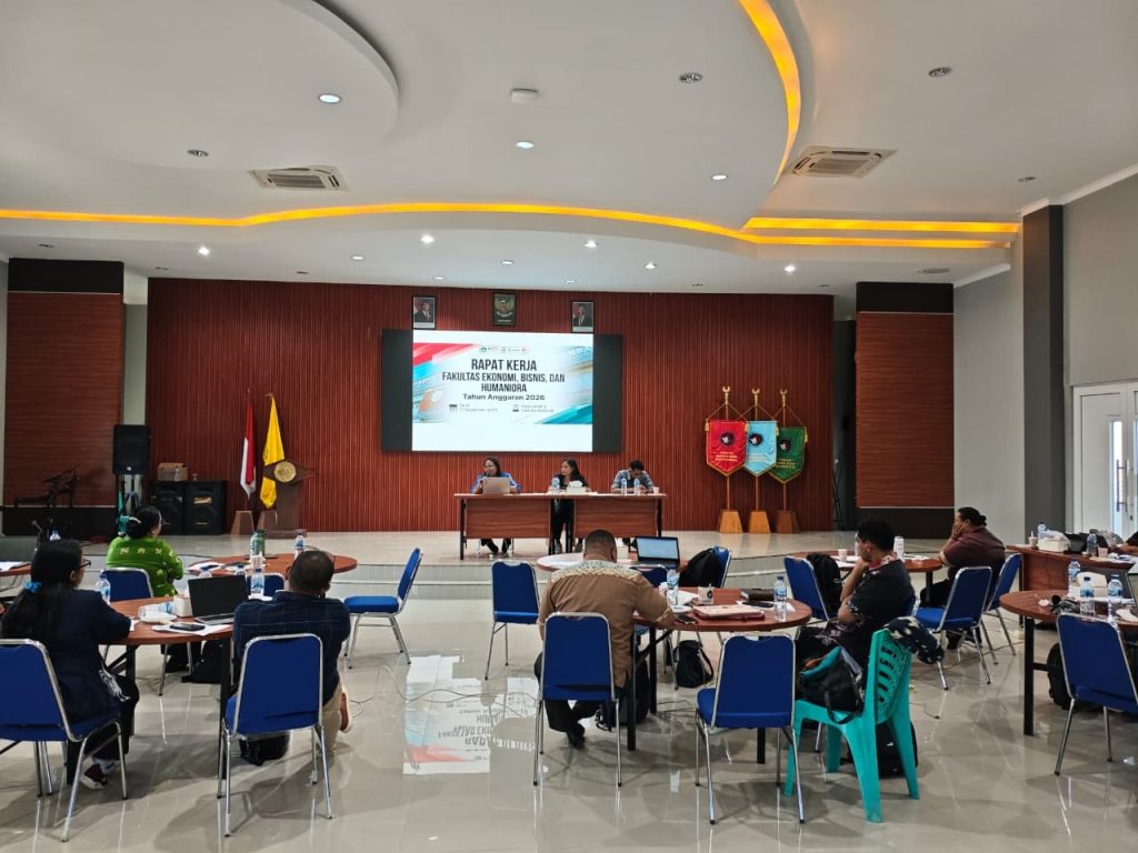 Rapat kerja diawali dengan doa bersama yang dipimpin oleh Ibu Dr. Pdt. Norlina Rambu Jola Kalunga, dilanjutkan dengan menyanyikan lagu kebangsaan Indonesia Raya, Hymne, dan Mars Unkriswina. Selanjutnya Dekan FEBH, Ibu Dr. Yulita Mila Pakereng, S.E., M.M menyampaikan sambutan dan sekaligus membuka kegiatan rapat kerja tahun anggaran tahun 2026. Selanjutnya para pimpinan sidang yakni Bapak Raymond Armando Letidjawa, S.H., M.H dan Ibu Fermike Lidyatami Radja, S.E., M.M membacakan tata tertib persidangan sekaligus membuka persidangkan rapat kerja tahun anggaran 2026. Pimpinan sidang memberikan kesempatan pertama kepada Dekan FEBH Ibu Dr. Yulita Milla Pakereng, S.E., M.M untuk mempresentasikan program kerja FEBH Tahun Anggaran 2026. Selanjutnya presentasi oleh Manajer Lab Kewirausahaan yakni Ibu Fitria Dwi, S.E., M.M mengenai Proyeksi Pendapatan dan Perencanaan Lab Kewirausaahan.