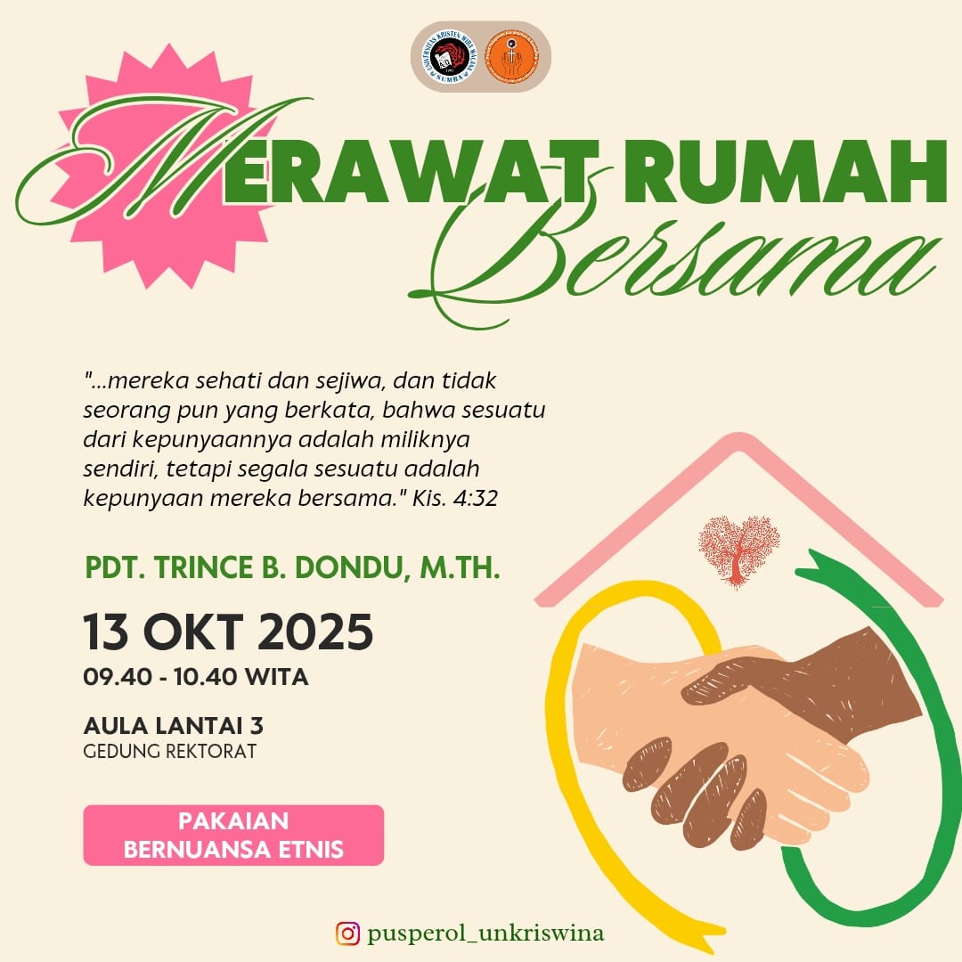 Selamat menjalani minggu kerja yang baru. Mari terus berupaya merawat kasih dalam rumah Keluarga Besar Unkriswina Sumba. Tuhan Yesus memampukan kita selalu!
