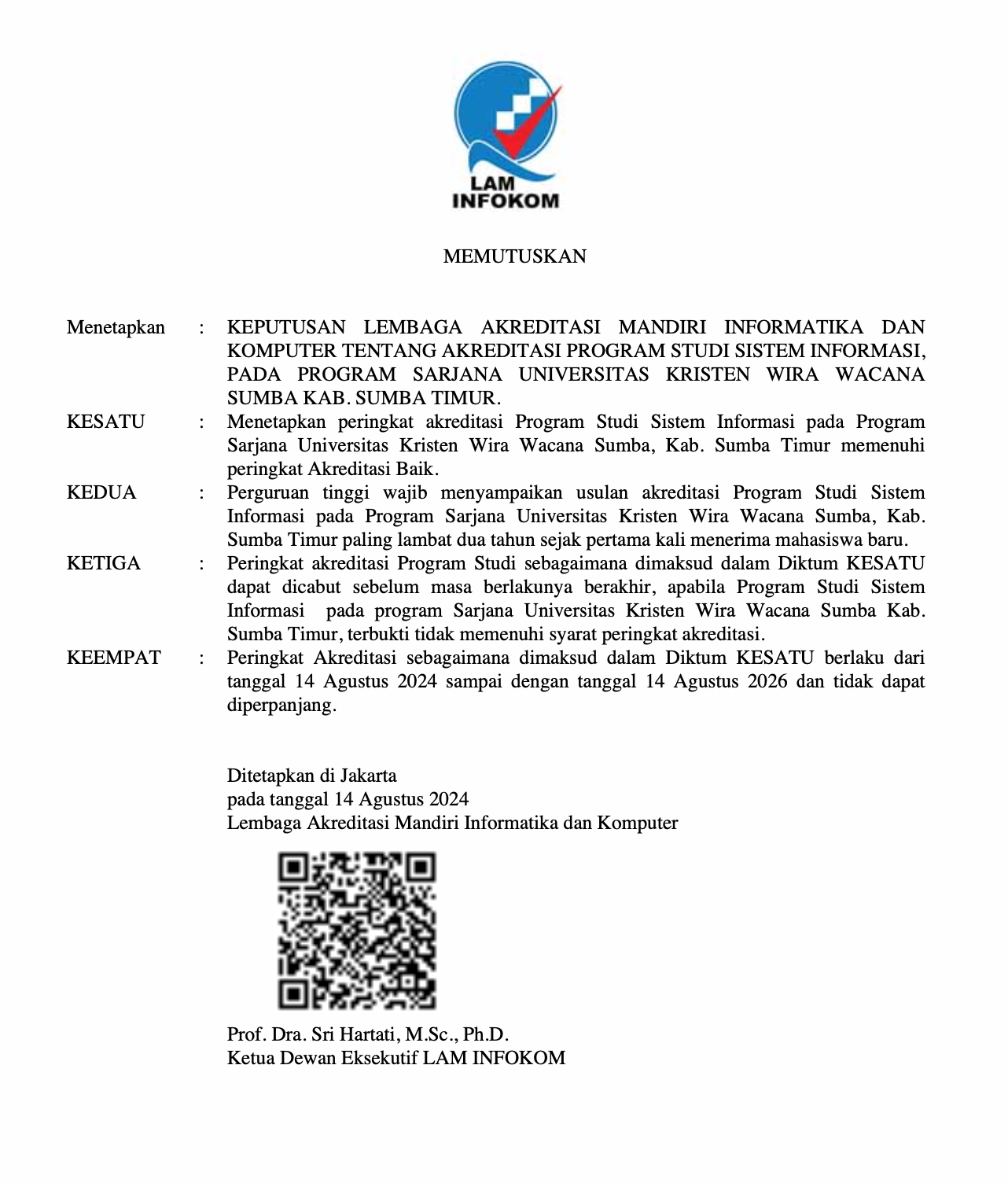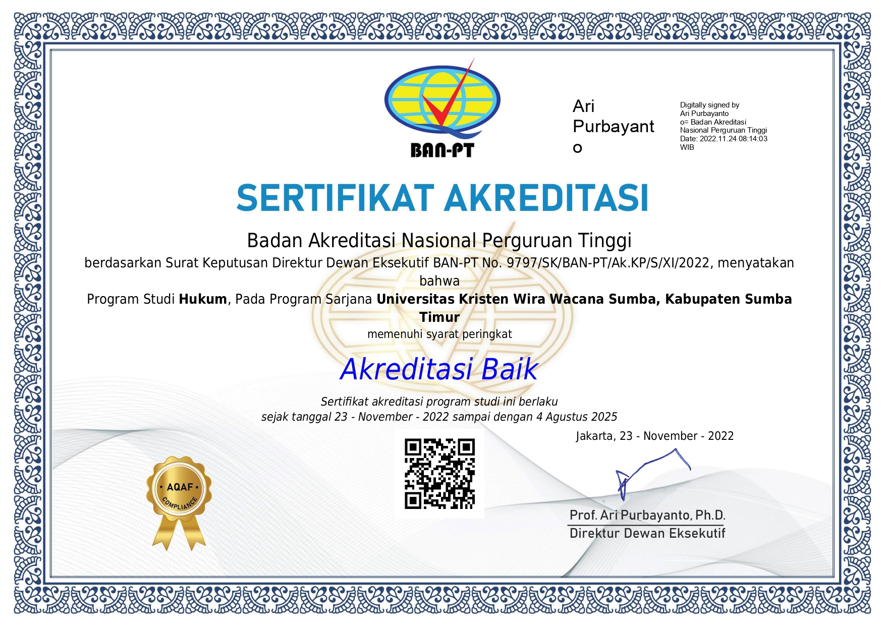 Dalam rangka melakukan evaluasi bentuk penilaian kelayakan mutu perguruan tinggi dan program studi, maka Universitas Kristen Wira Wacana Sumba telah mengajukan akreditasi pertama melalui Badan Akreditasi Nasional – Perguruan Tinggi (BAN-PT). Sampai dengan saat ini Universitas Kristen Wira Wacana Sumba, baik perguruan tinggi dan program studi telah memiliki peringkat akreditasi seperti yang telah ditetapkan baik dalam bentuk Surat Keputusan maupun Sertifikat. Dengan demikian, Universitas Kristen Wira Wacana Sumba tetap berkomitmen untuk terus memperbaiki mutu demi kemajuan dunia Pendidikan