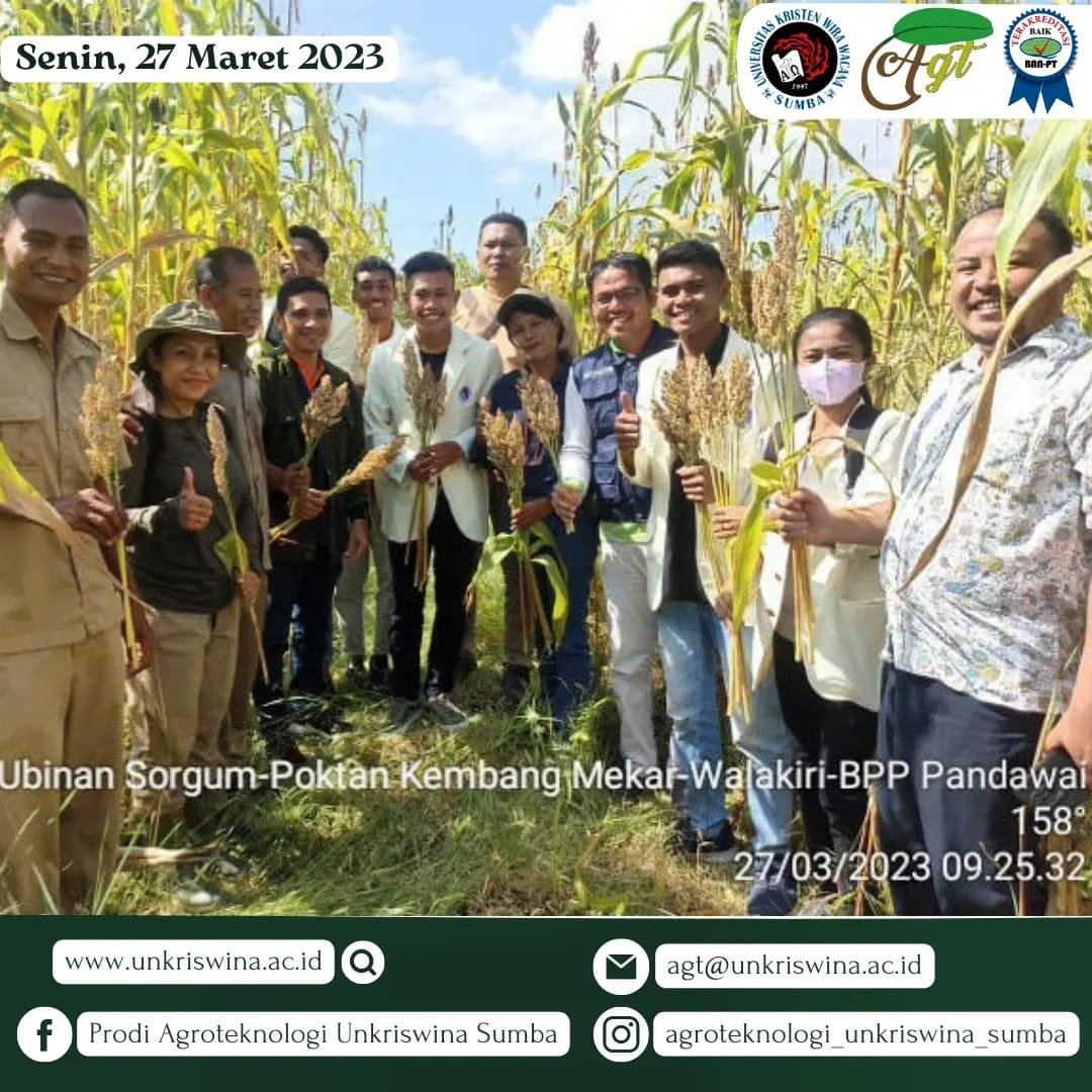 Pada hari Senin, 27 Maret 2023 telah dilakukan pemanenan tahap 1 tanaman sorgum varietas super 1 di Kelurahan Watumbaka – Kecamatan Pandawai. Proses pemanenan ini melibatkan Mahasiswa MBKM-Magang Program Studi (prodi) Agroteknologi (AGT) dari Fakultas Sains dan Teknologi (FST) Unkriswina Sumba didampingi Ketua Prodi AGT, Bapak Uska Peku Jawang, S.Si., M.P didampingi dosen Prodi AGT, Bapak Yonce Melyanus Killa, S.P., M.P., staff dari Dinas pertanian dan Pangan Sumba Timur, Balai Penyuluhan Pertanian, Perikanan, dan Kehutanan (BP3K) Pandawai termasuk didalamnya adalah semua Penyuluh Pertanian Lapangan (PPL) Pertanian sekecamatan Pandawai. Lahan penanaman ini milik Gabungan kelompok tani (Gapoktan) Kembang Mekar di bawah binaan BP3K Pandawai – Dinas Pertanian dan Pangan Sumba Timur. Sejak September 2022 – Januari 2023, lahan ini digunakan sebagai salah satu lokasi MBKM- Magang oleh mahasiswa prodi AGT- Unkriswina sumba didampingi oleh pihak BP3K Pandawai dan Sorgum Indonesia Group (SIG). Dari hasil panen tahap 1 diperoleh produksi sorgum sebesar 1,6 ton/Ha.