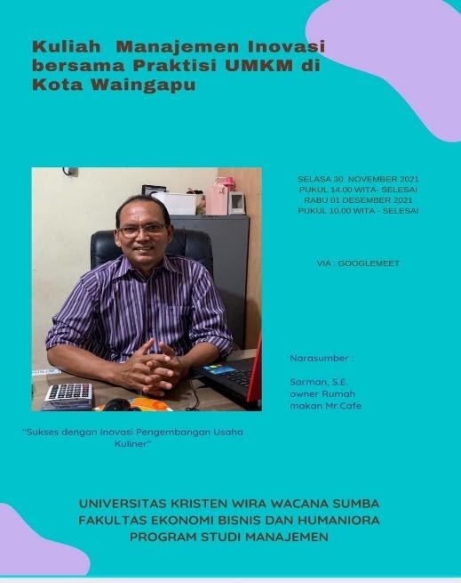 Praktisi dalam perkuliahan ini yaitu Bapak Sarman, S.E, beliau merupakan Owner Rumah Makan Mr.Cafe berlokasi di Waingapu, Sumba Timur. Berdasarkan sejarahnya bahwa Rumah makan Mr. Café awalnya merupakan usaha kecil yang dijalankan dengan mengandalkan tenda kecil dan sangat terbatas, namun karena strategi usaha dan adanya inovasi yang baik yang telah dilakukan oleh pemilik rumah makan sehingga saat ini rumah makan tersebut telah berubah menjadi rumah makan yang sangat baik dan usahanya sangat berkembang dengan pesat.